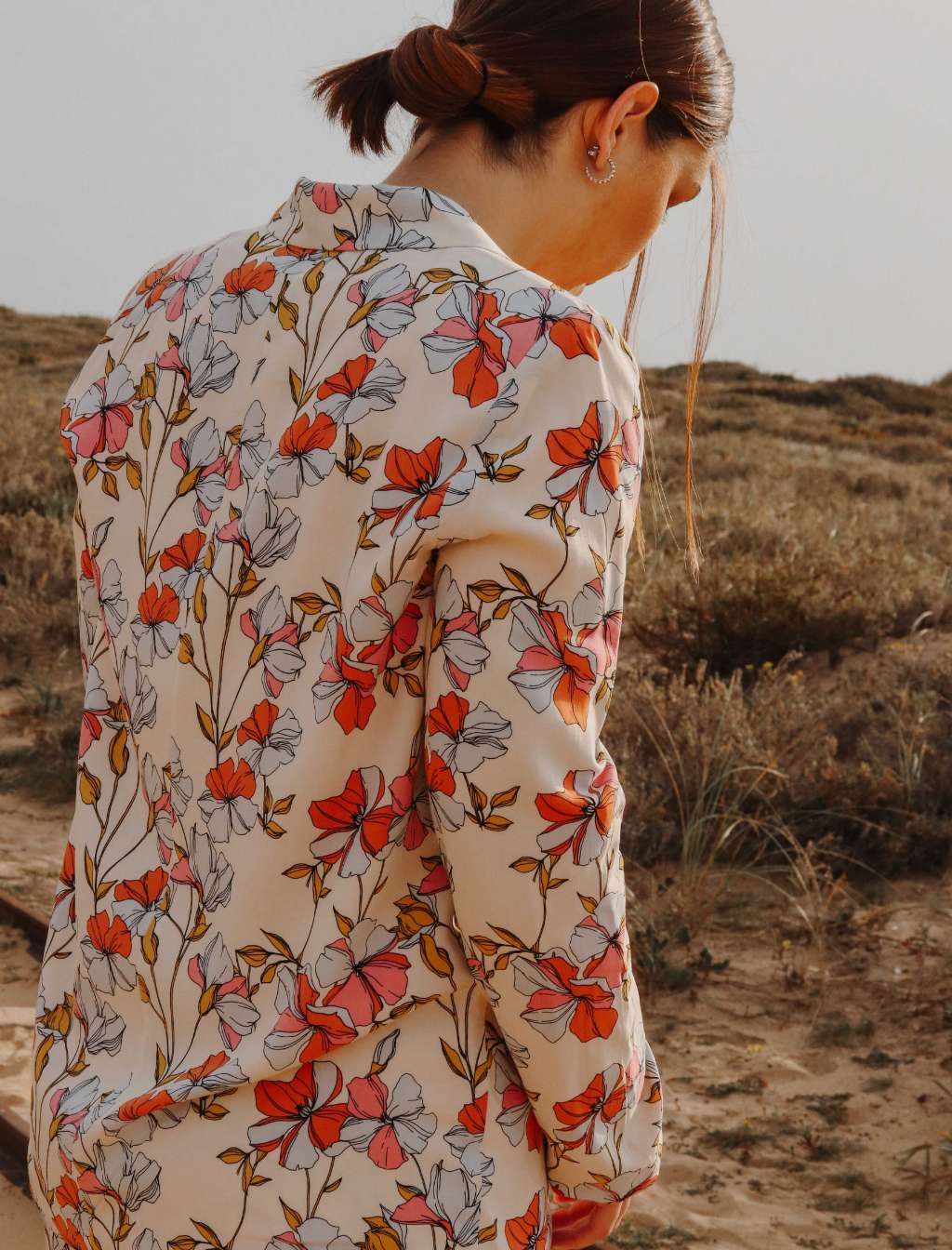 Blazer comprido estampado com forro em viscose. Bolsos frontais e chumaços nos ombros. Botão forrado na frente.