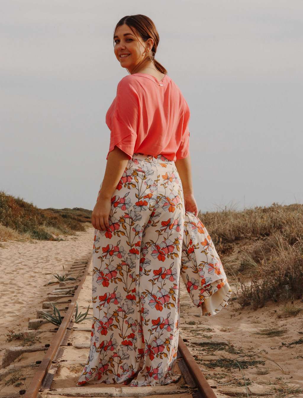 Blusa comprida com manga morcego em V. Ombros descaídos. Decote largo redondo.