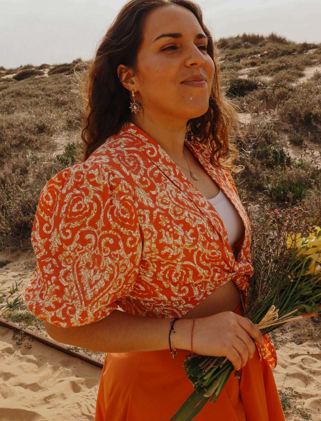 Camisa curta com nó e com mangas balão estampada. Mangas com elástico. Pinças nas costas.