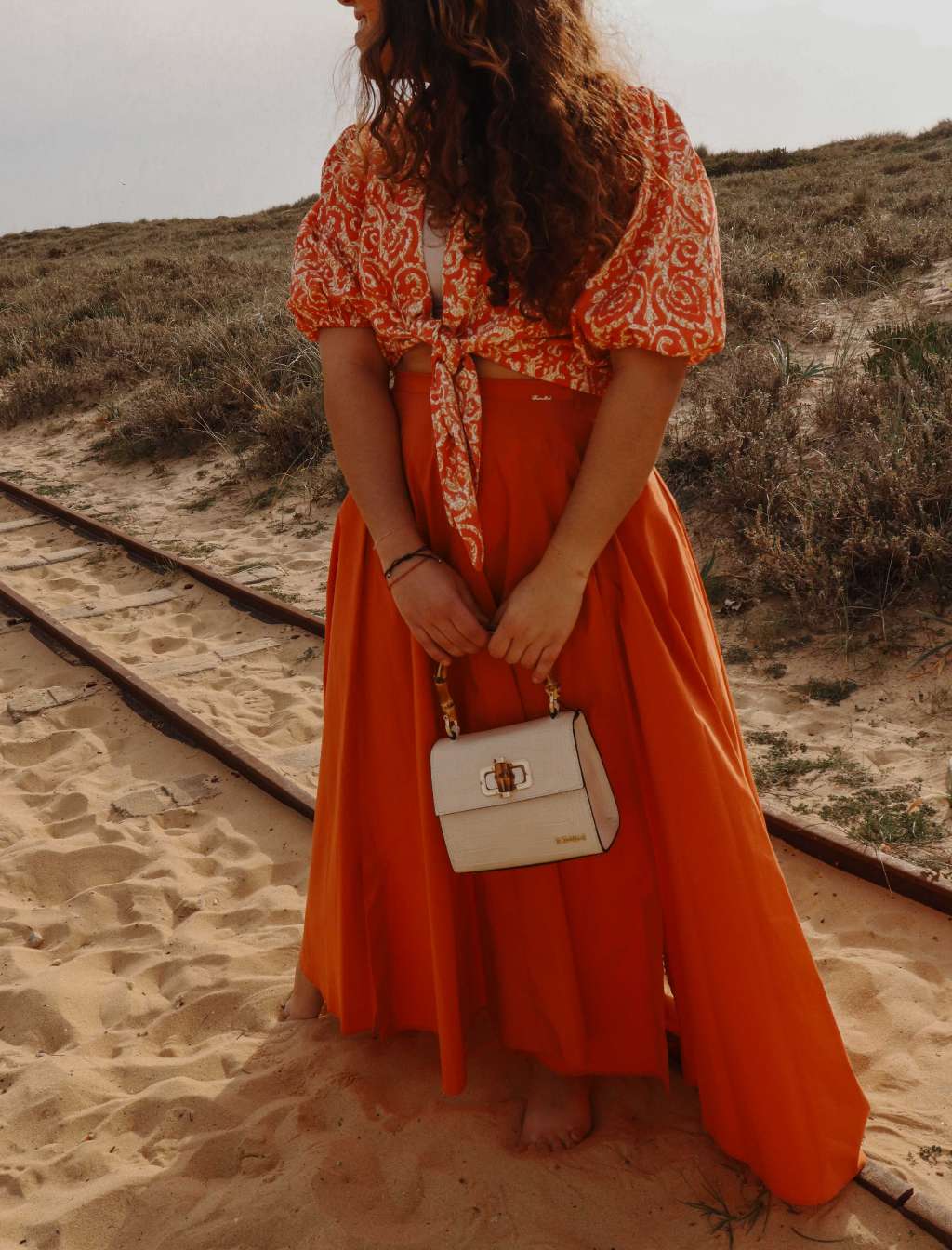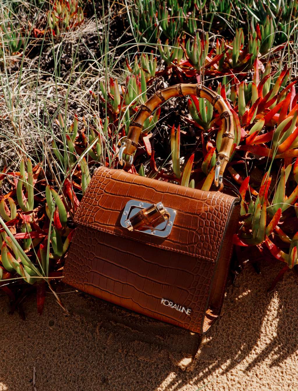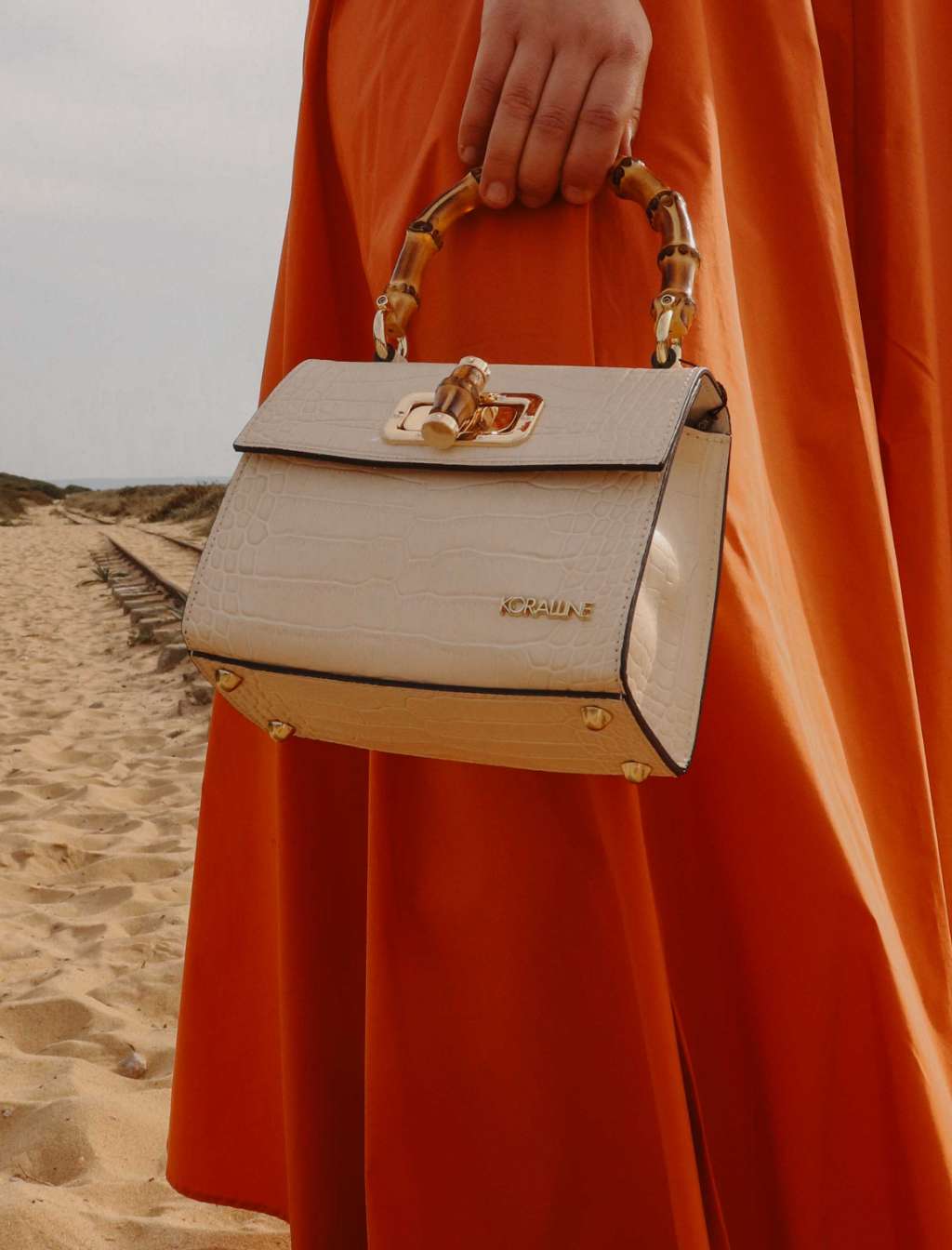 Mala em pele com alça Bambú. Possibilidade de colocar a tiracolo. Aba com fecho em bambú.