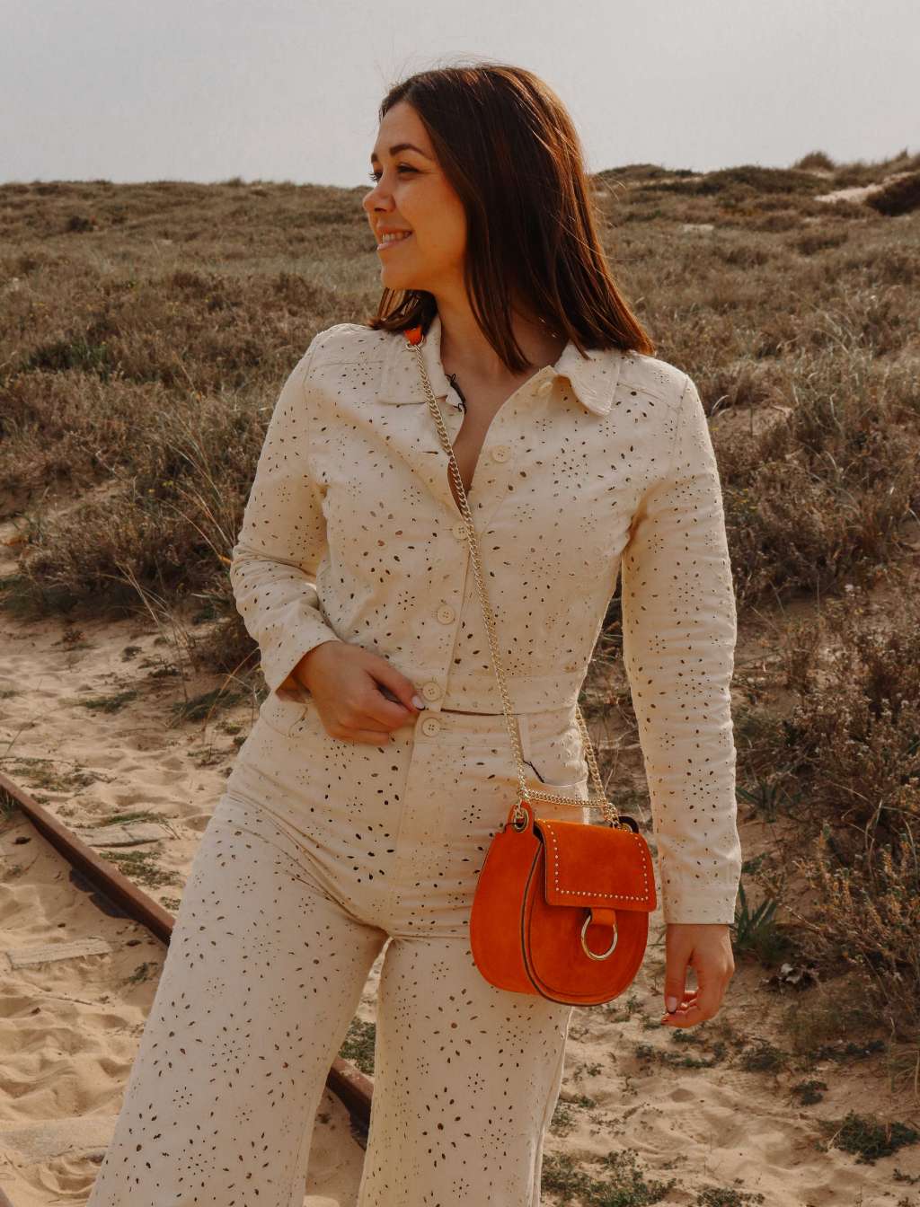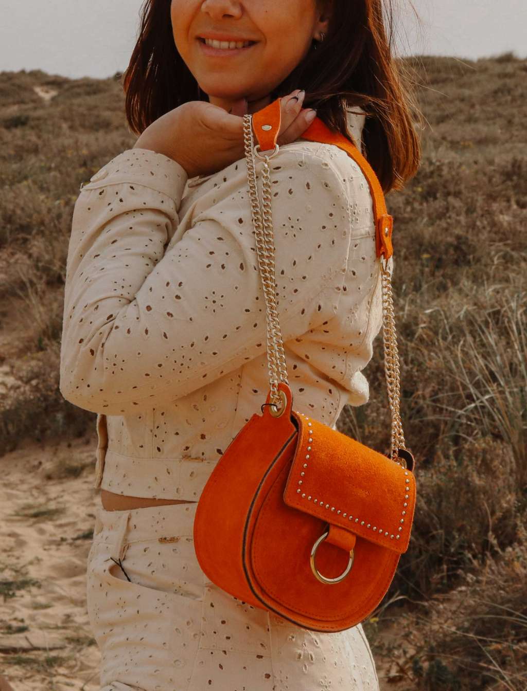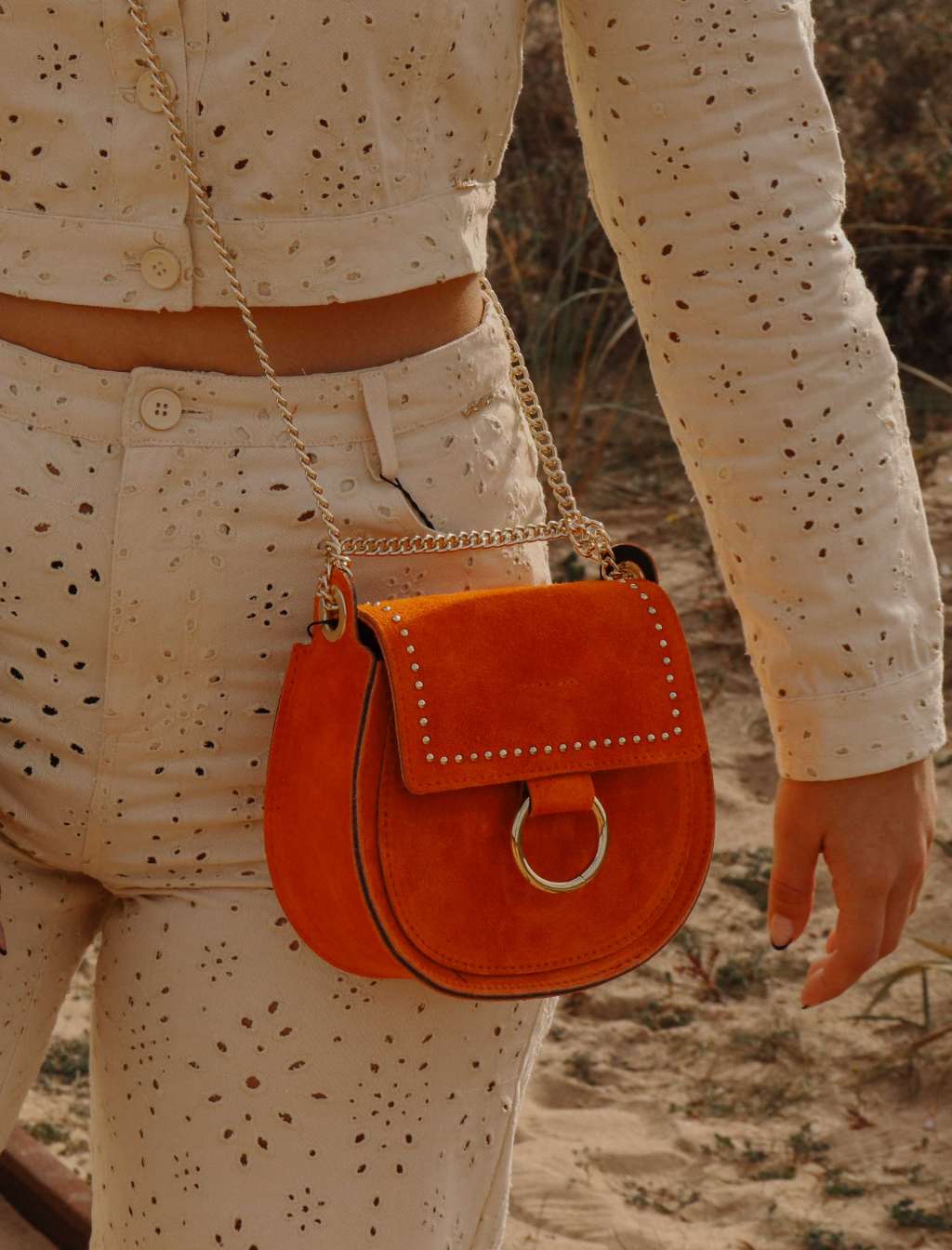 Mala tiracolo California Style em camurça com aplicações em Dourado. Aba com fecho magnético.
