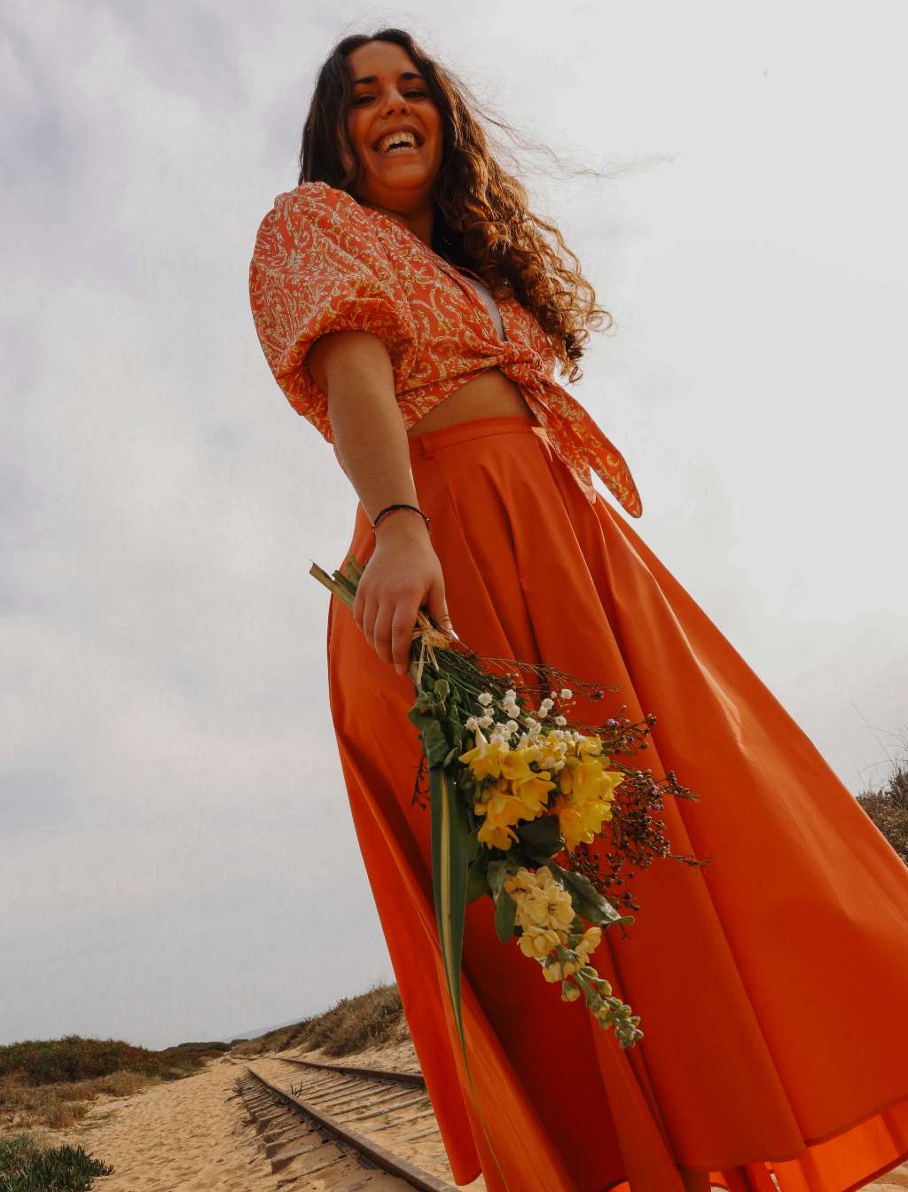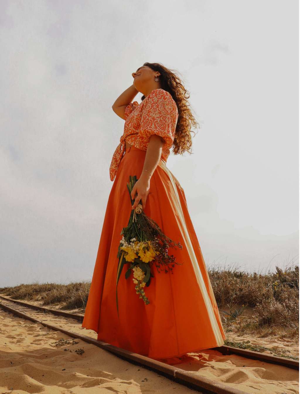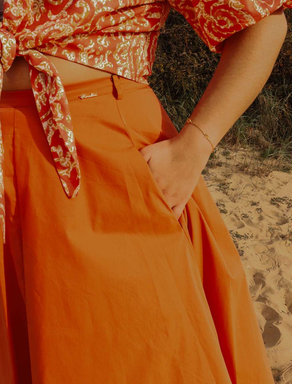Saia comprida com efeito acetinado com prega. Bolsos laterais.