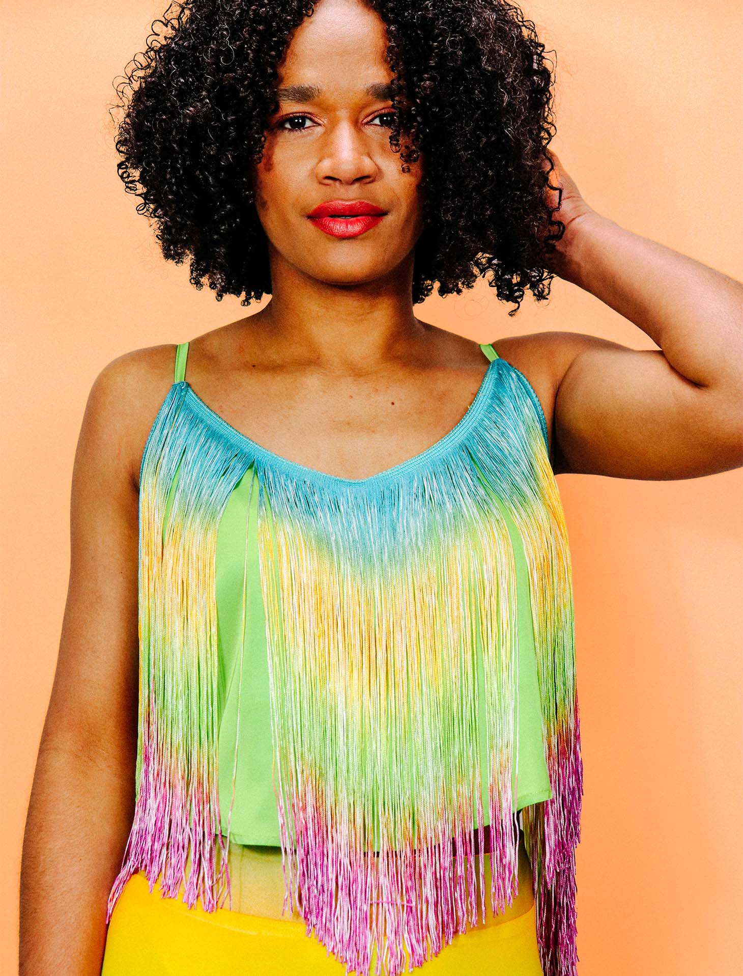 Top curto de alças ajustáveis com franjinhas em degradê.