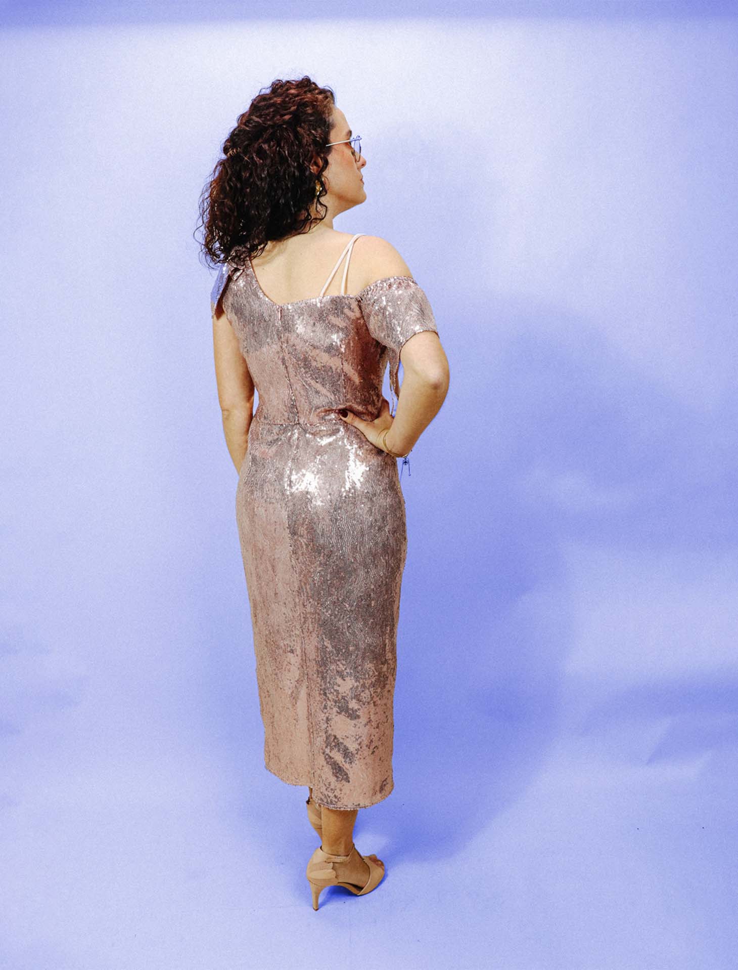 Vestido de festa de corte direito, revestido a lantejoulas. Ombros assimétricos e decote em forma de coração.