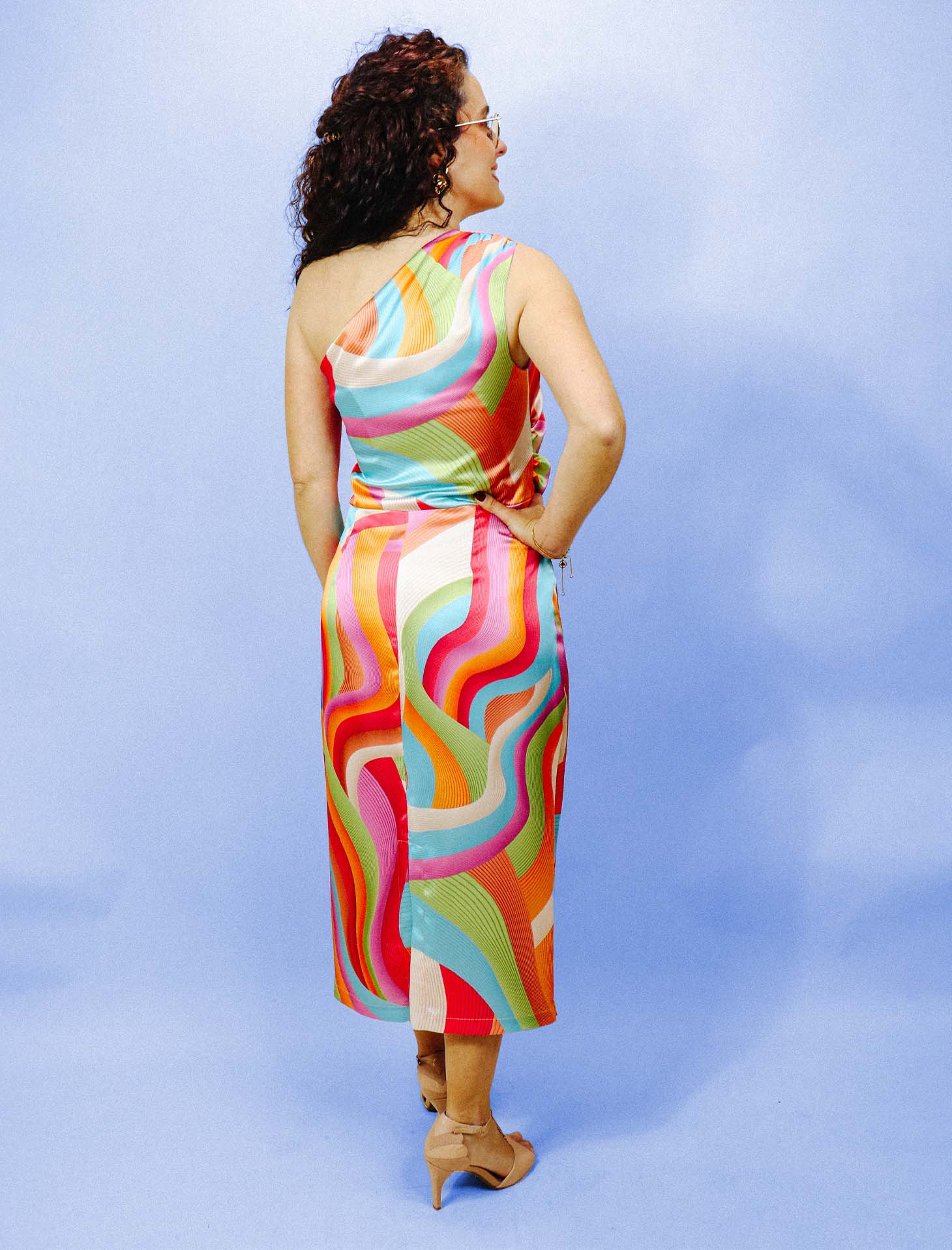 Vestido de festa com apenas uma cava, drapeado na zona do peito e cintura.